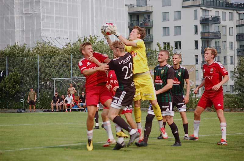 följd. Milos Marinkovic kan senare snappa upp bollen, men förlägger den på hel fel sida av burgaveln.