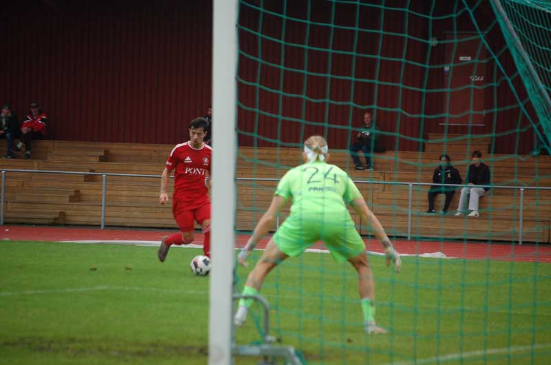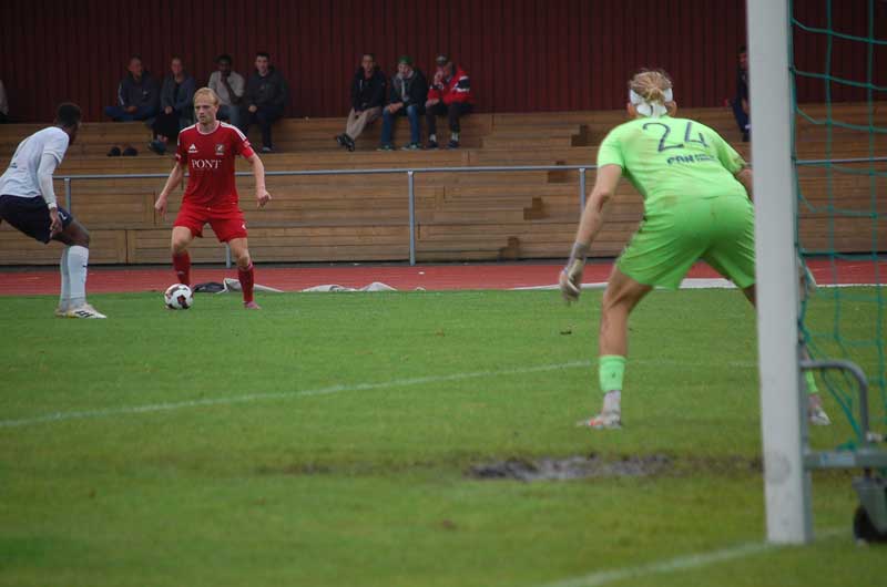 att det äntligen skall ringa. Men icke denna gång heller. Skottet går just utanför bortre stolpen.