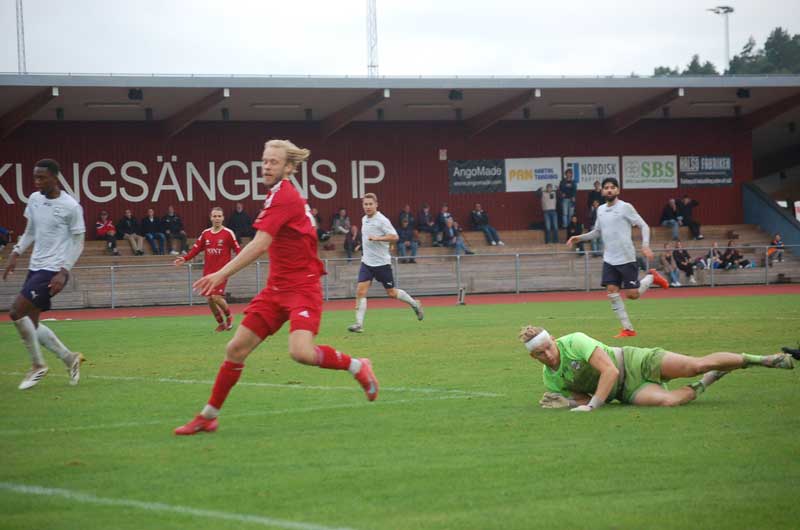 I den 32:a minuten kommer ett inlägg från vänster som Släggan Östlund på direktvolley skjuter mitt i solar plexus på KIF-Simon i målet och det inne i