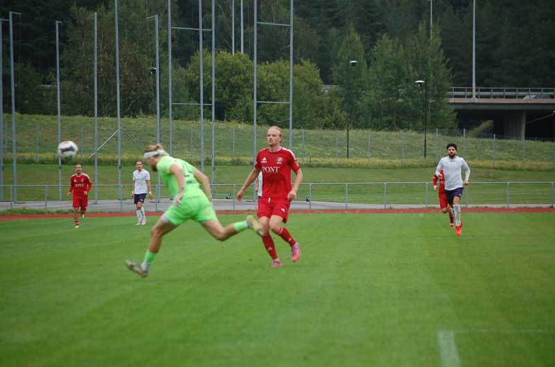 Mål-Simon, som fått jobba hårt så här långt, skall göra en utspark i den 39:e minuten men träffar ”Släggan” i akterpartiet, varvid bollen rikoschetteras som en