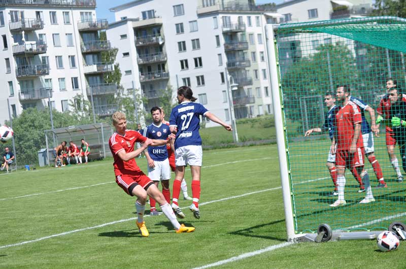 högerkanten slår in en boll som Henrik Zacco går upp och nickar mot mål. Bollbanan tangerar ribbans underkant, för att senare med viss hjälp av en av